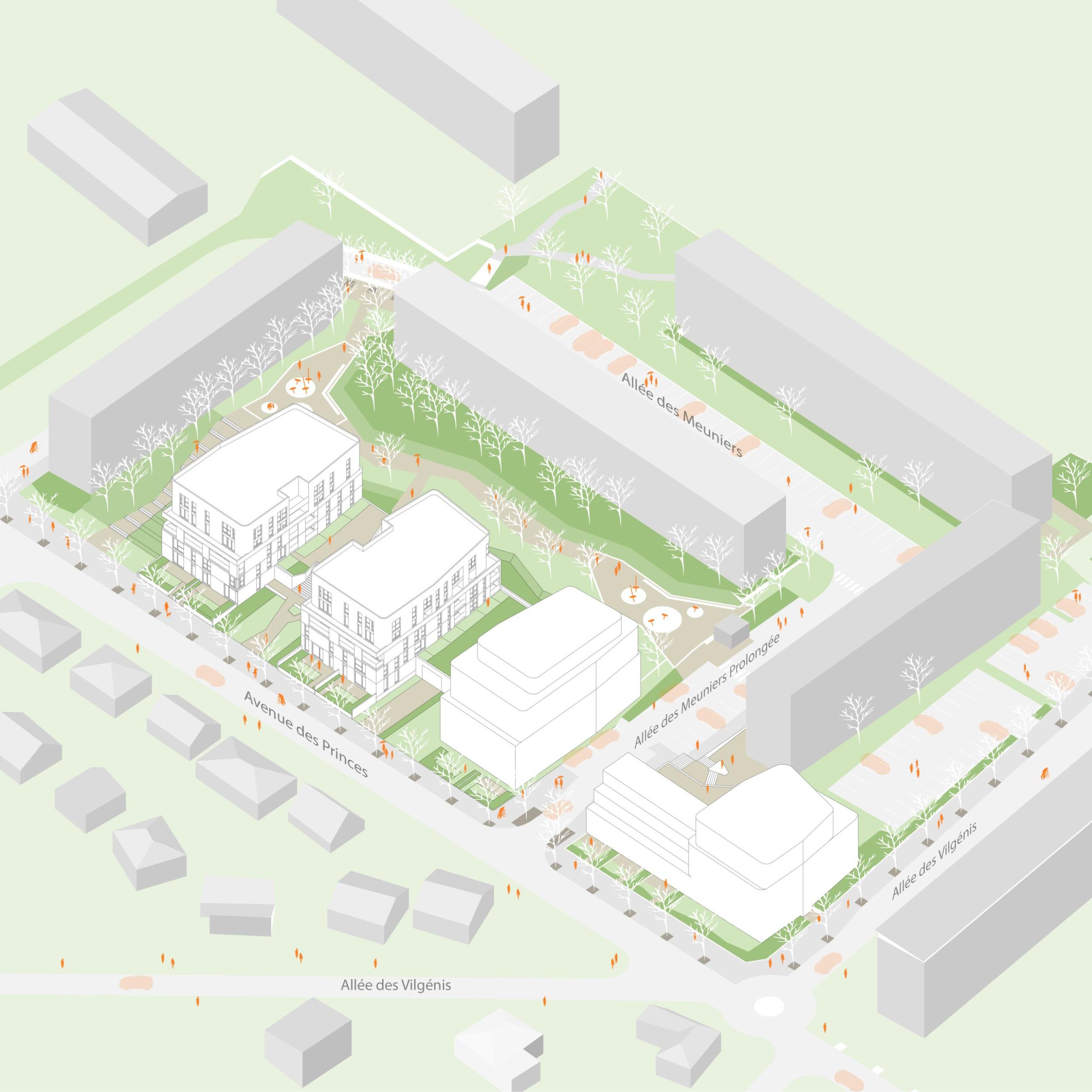 L’implantation privilégie des espaces verts généreux, dont un cœur d’îlot structurant et un square central revalorisé. L’architecture, sobre et élégante, associe un socle en béton matricé, un attique en enduit minéral et des menuiseries bois-aluminium.