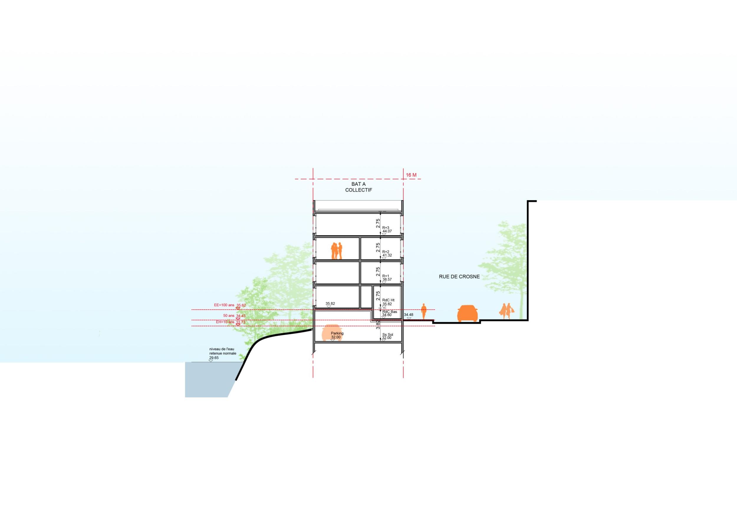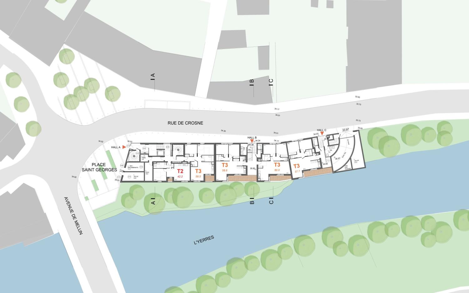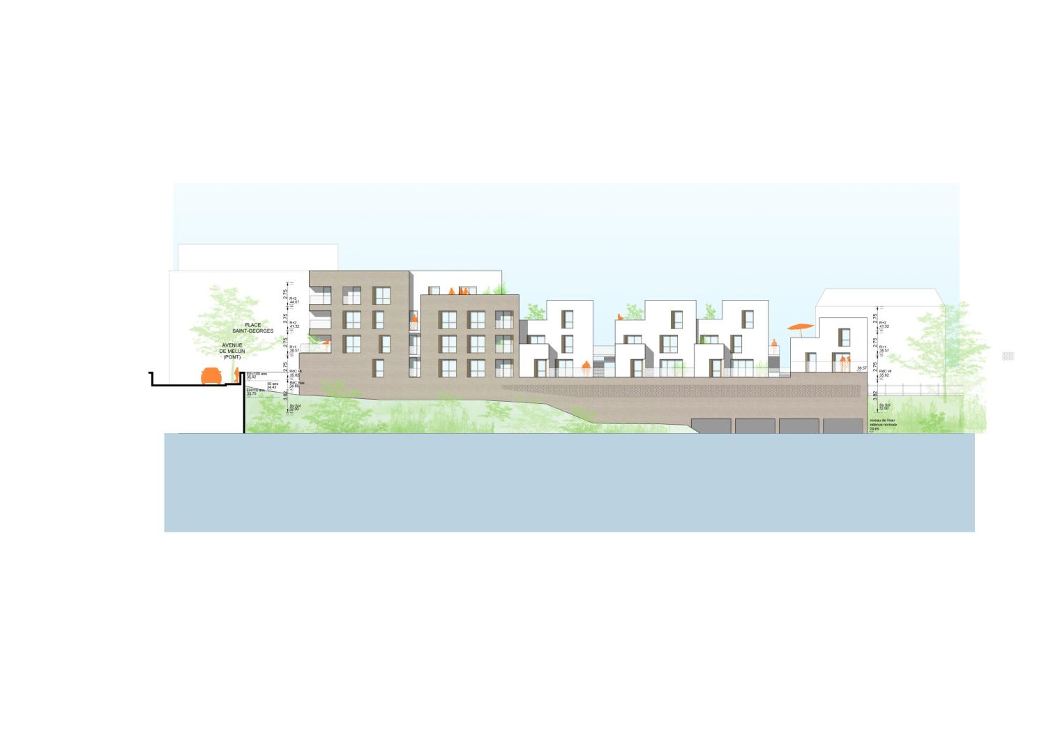 Le bâtiment principal, revêtu de brique moulée main, s’affirme sur la place Saint-Georges, tandis que des volumes plus bas s’étirent le long de la rue de Crosnes pour favoriser une transition douce avec le quartier. L’implantation tire parti du paysage en ouvrant des vues sur l’Yerres et en intégrant des principes de transparence hydraulique.