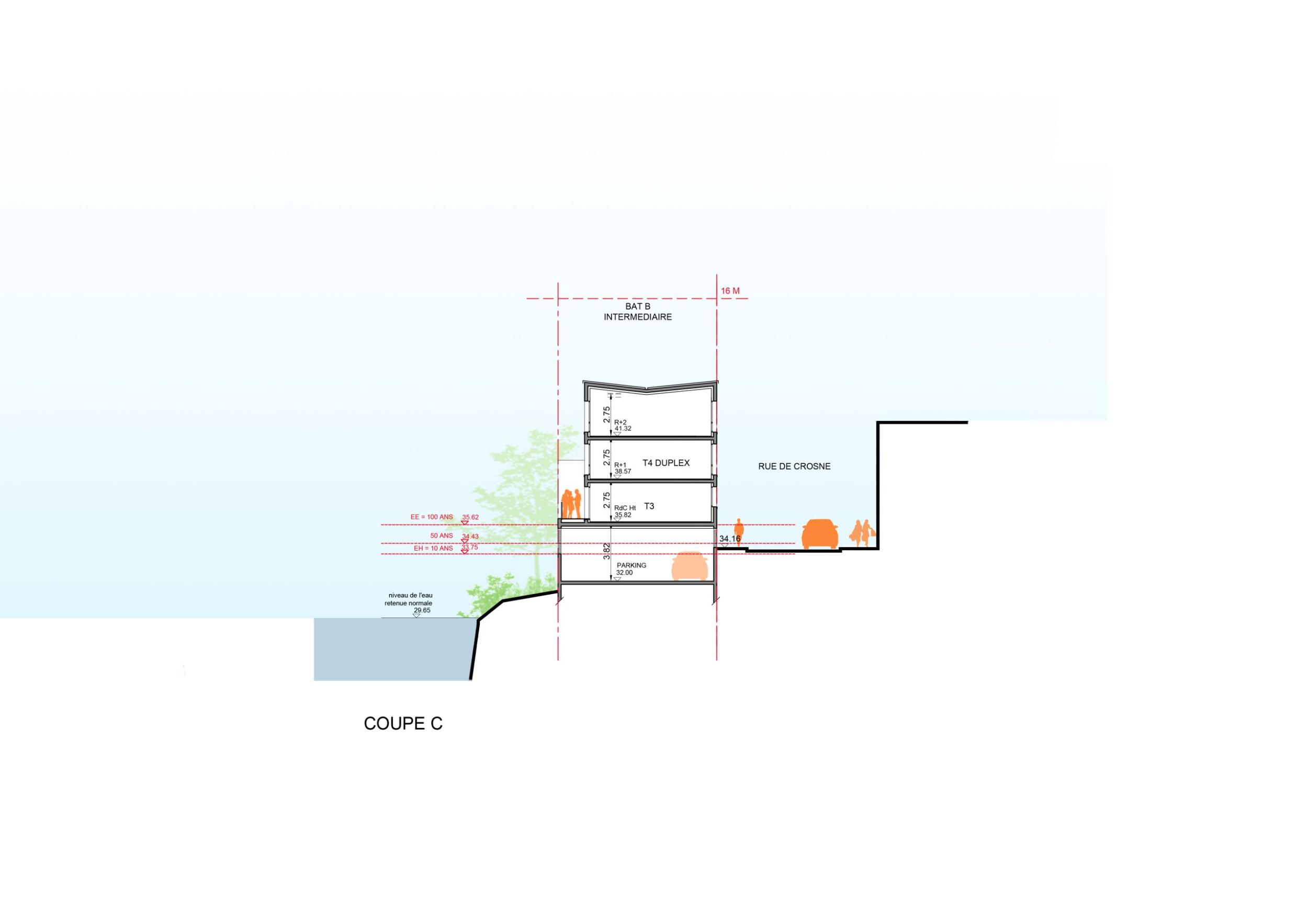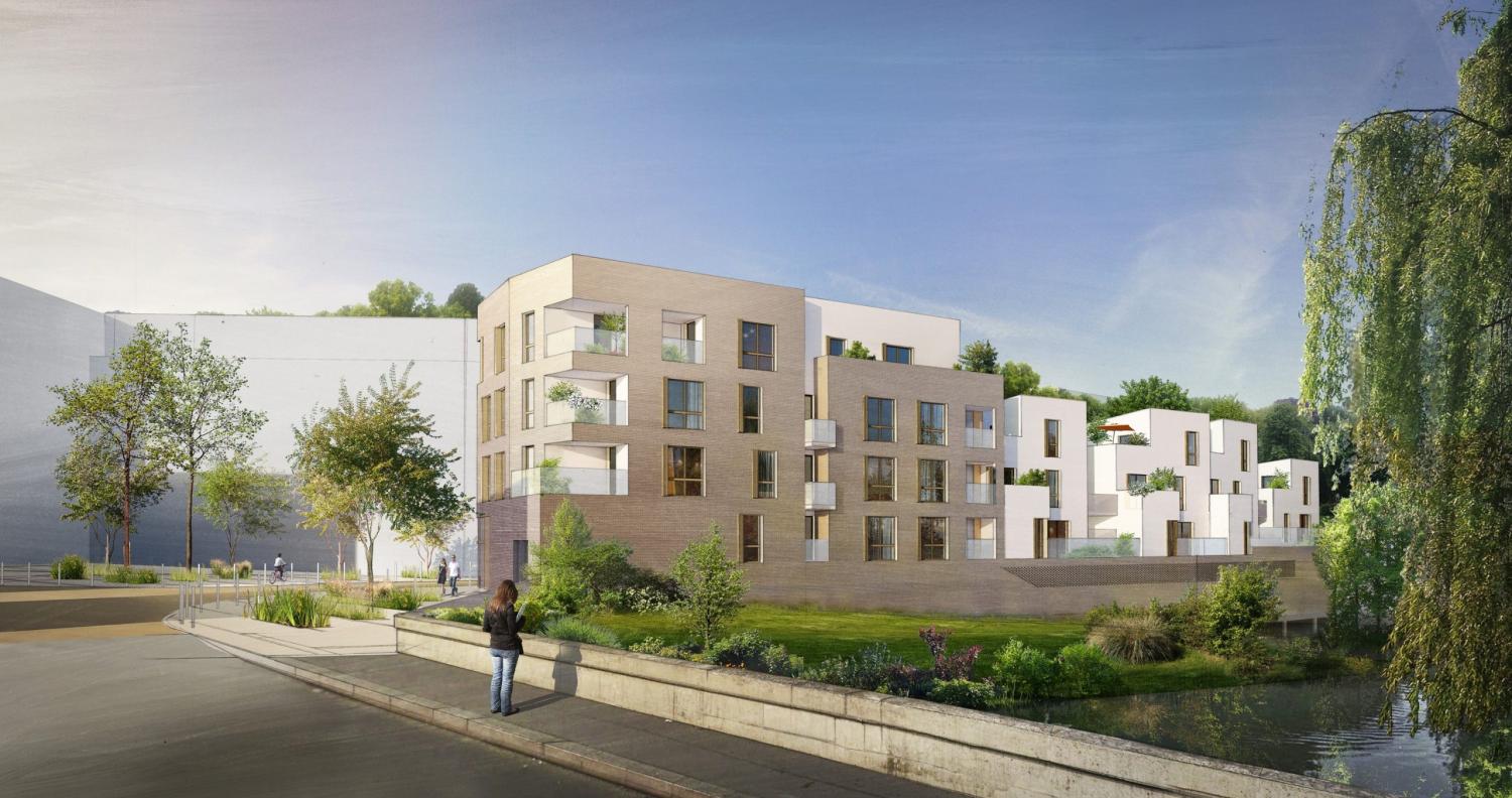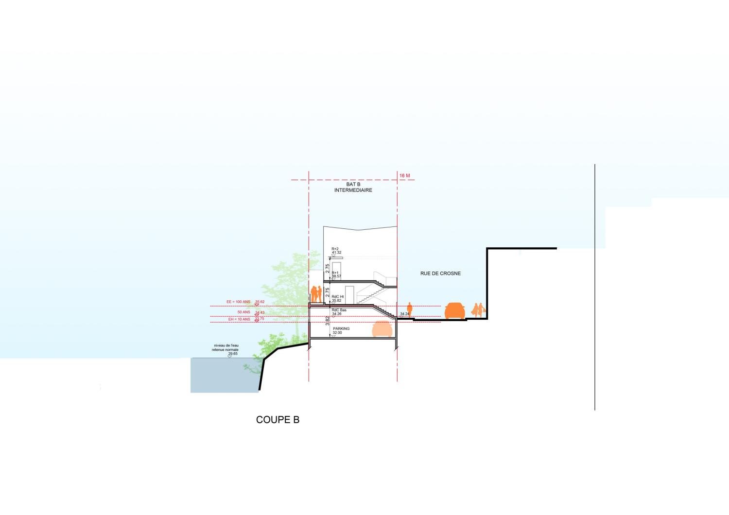 Le bâtiment principal, revêtu de brique moulée main, s’affirme sur la place Saint-Georges, tandis que des volumes plus bas s’étirent le long de la rue de Crosnes pour favoriser une transition douce avec le quartier. L’implantation tire parti du paysage en ouvrant des vues sur l’Yerres et en intégrant des principes de transparence hydraulique.