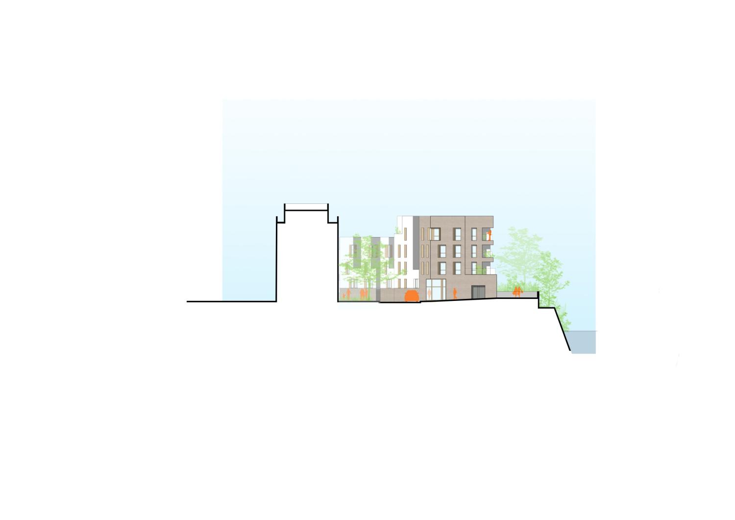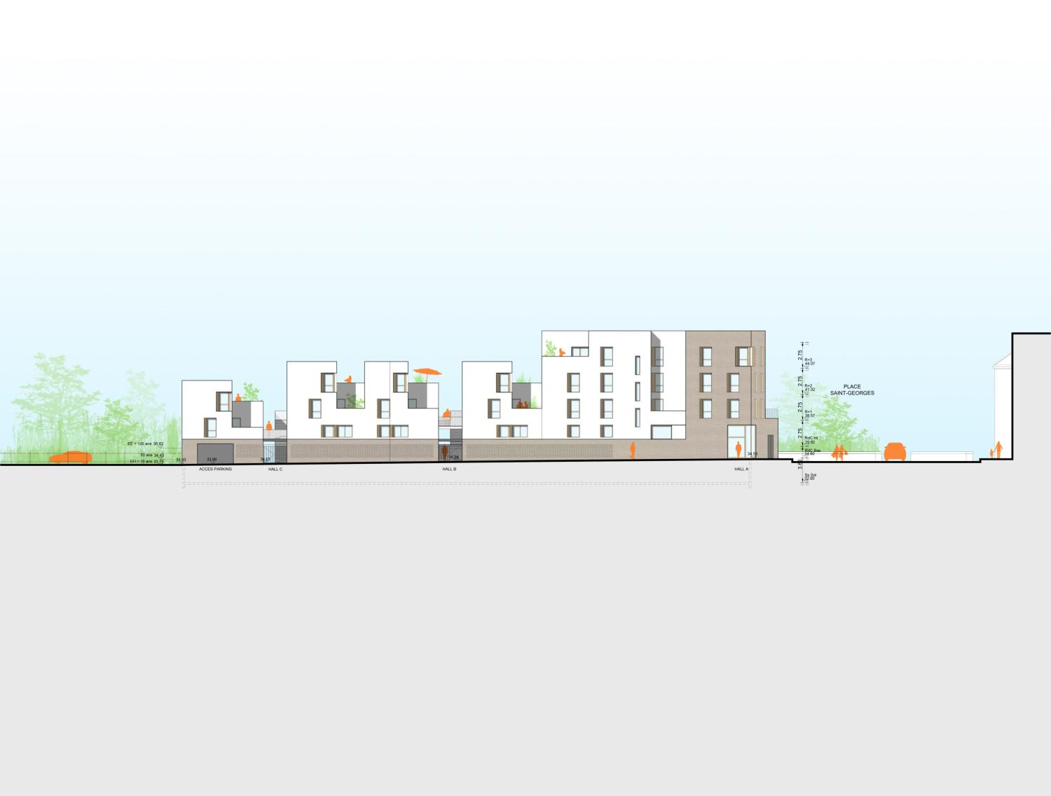 Les logements, baignés de lumière grâce à leur orientation sud, disposent de généreuses terrasses et d’un accès fluide depuis l’espace public. La diversité des hauteurs et le choix de matériaux authentiques confèrent au projet une identité forte et contemporaine, tout en respectant l’échelle et le caractère du site. Cette réalisation allie intégration paysagère, qualité résidentielle et harmonie architecturale pour un cadre de vie serein et lumineux.